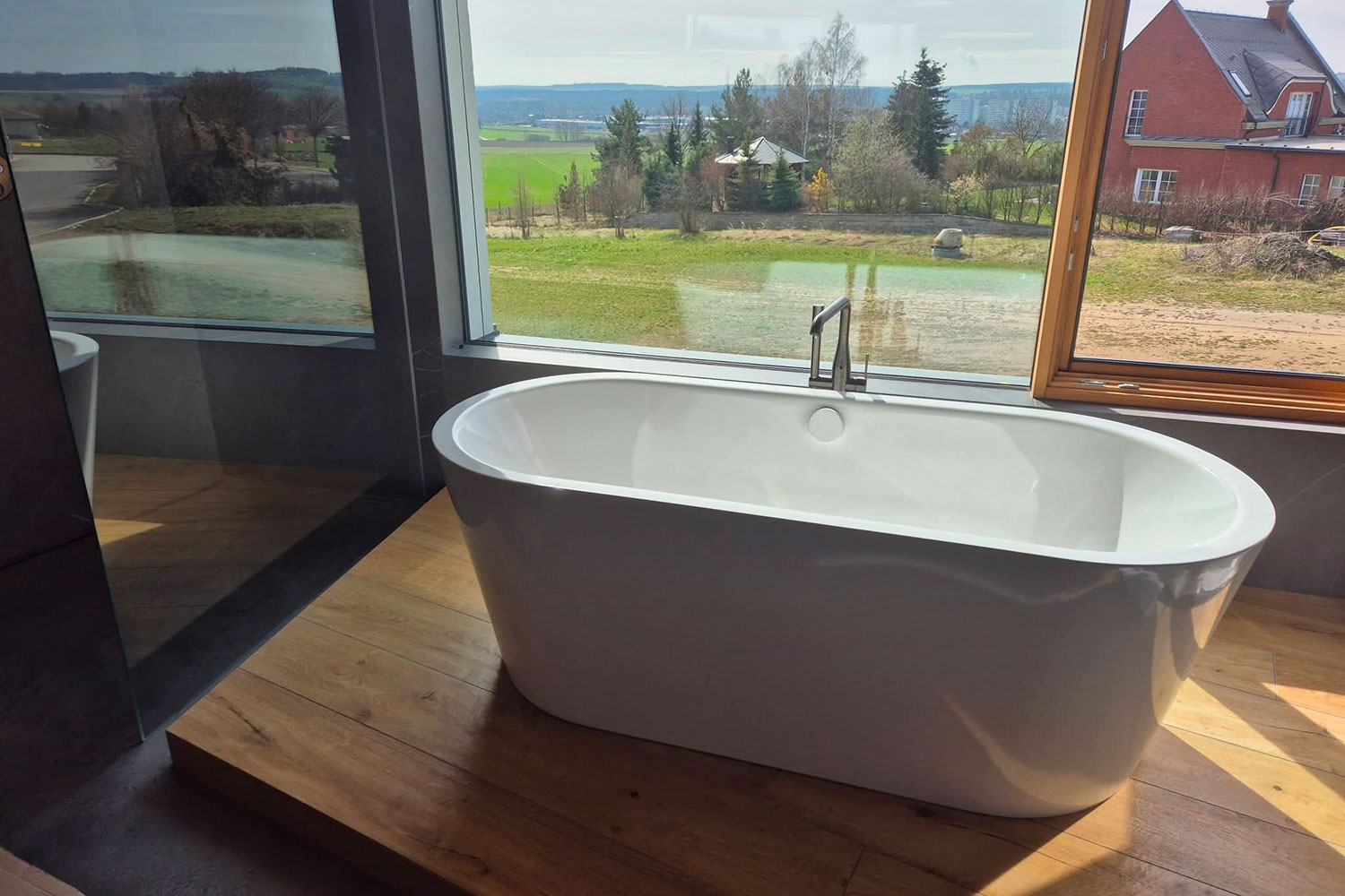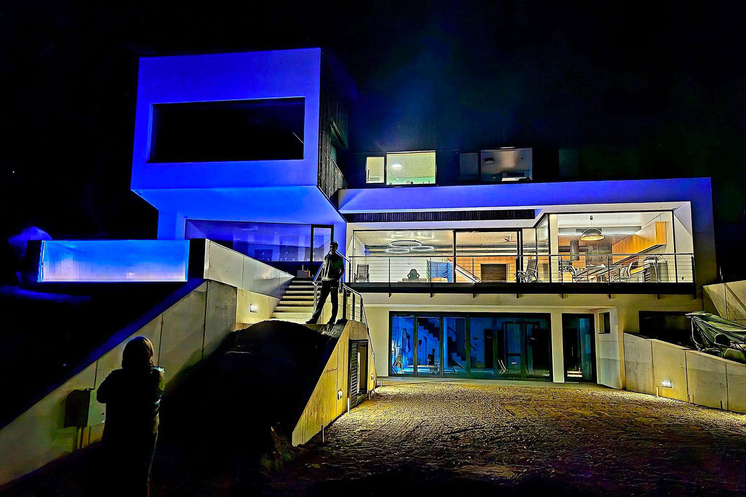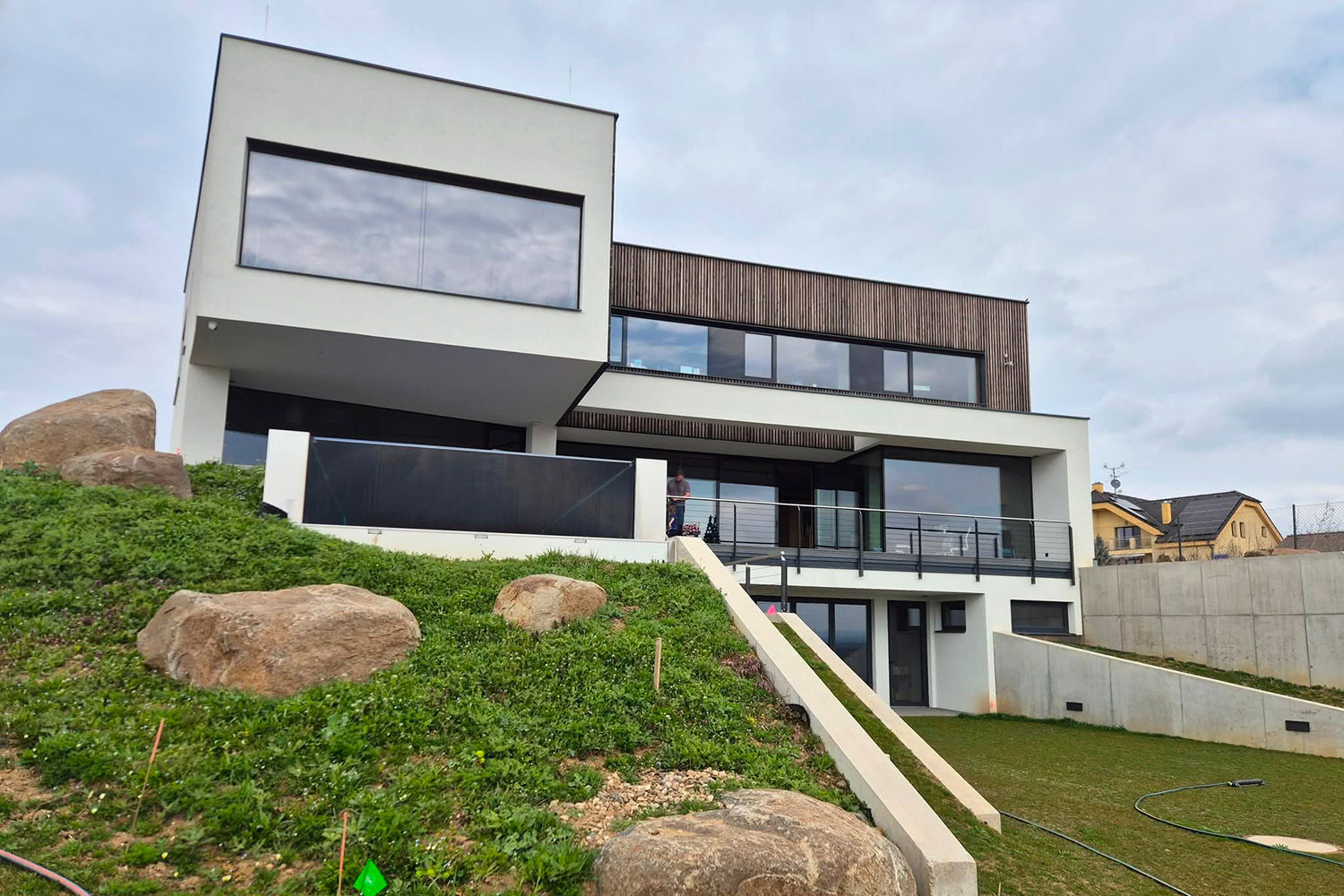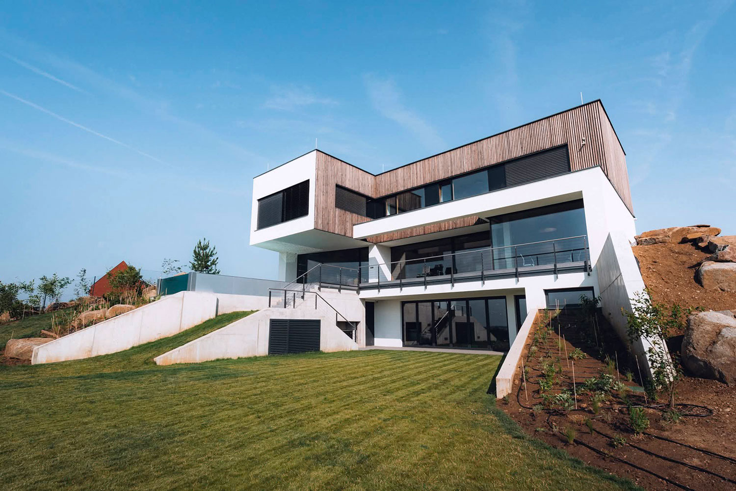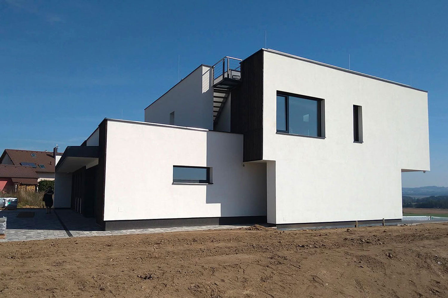 Dům tvoří dvě hmoty – hlavní přízemní do ulice a menší patrová do zahrady, částečně vykonzolovaná nad bazén s terasou. Objekt je částečně podsklepen, má plochou pochozí střechu s FVE panely a klimatizacemi. Fasáda kombinuje bílou omítku a opálené dřevo, okna jsou hliníková s trojskly, oplocení z hliníku.