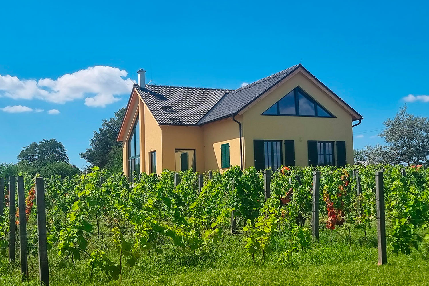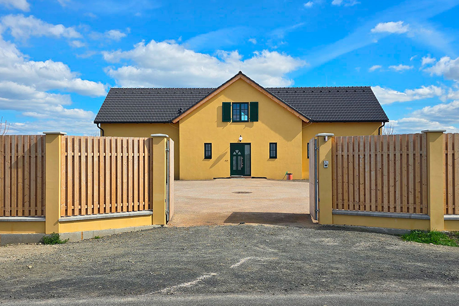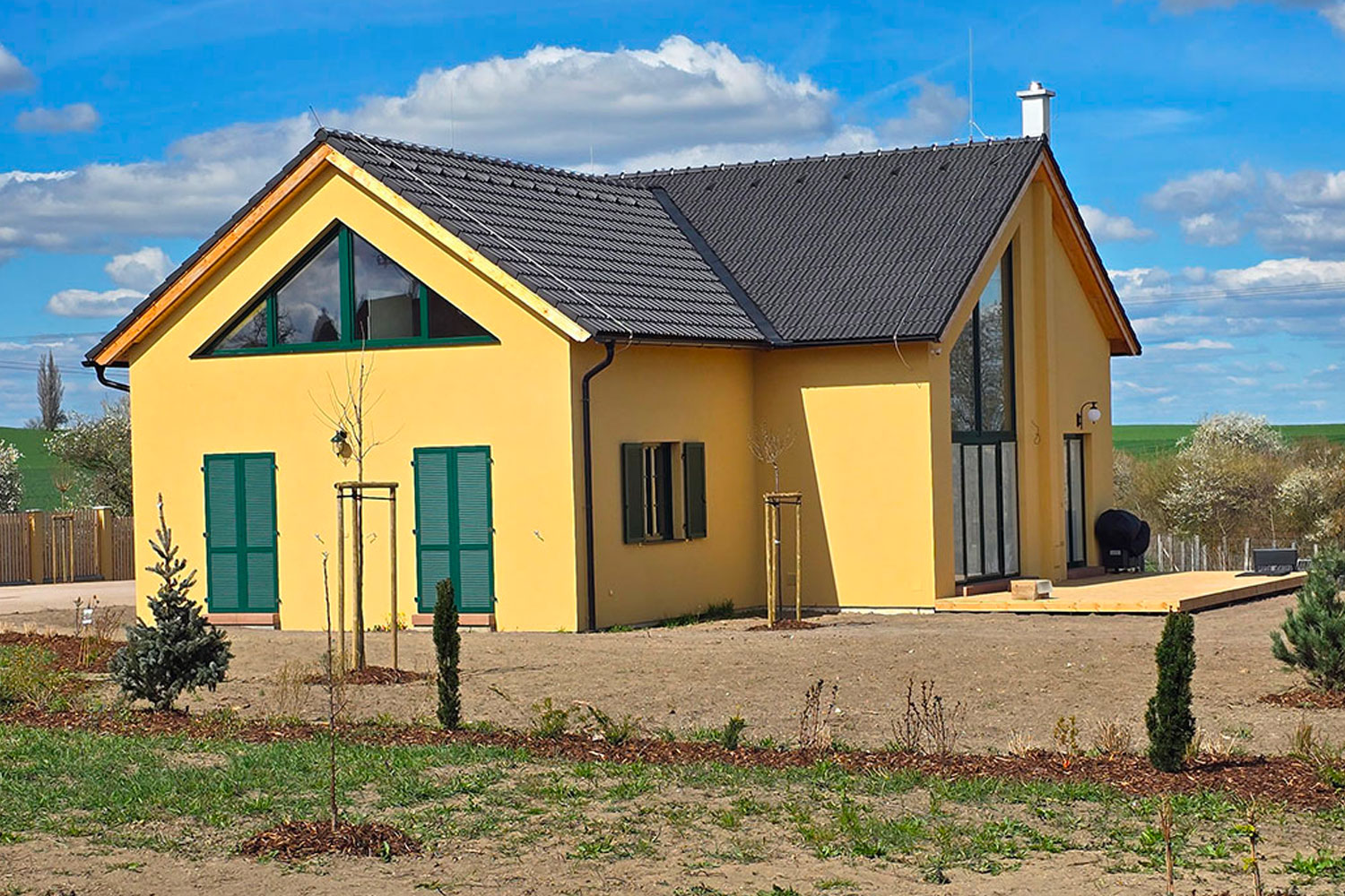 Rodinný dům má tradiční venkovskou formu s hlavním převýšeným traktem a dvěma křídly s podkrovím. Uzavřený k silnici, otevírá se do krajiny. Uspořádán je kolem centrálního obytného prostoru s galerií a pokoji v křídlech. Krov je pohledový, terasy dřevěné, zpevněné plochy mlatové, okna i okenice hliníkové.