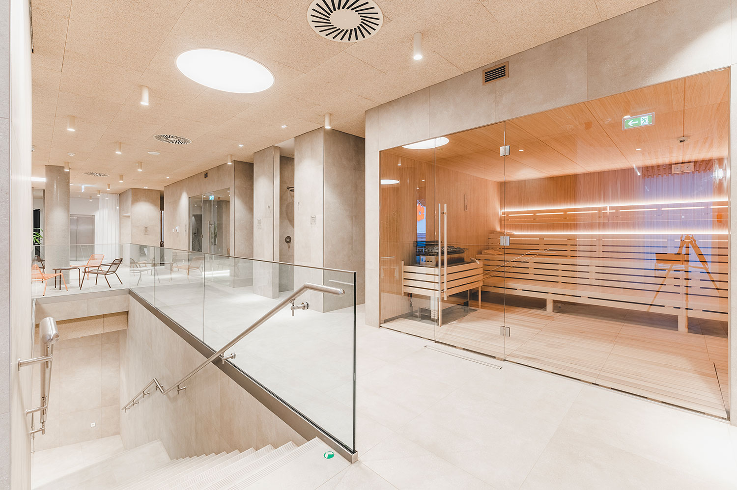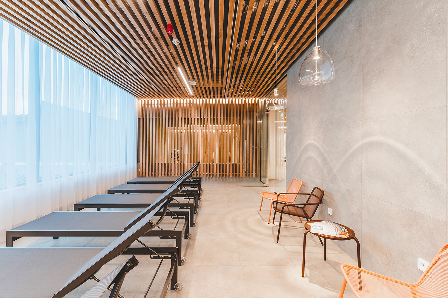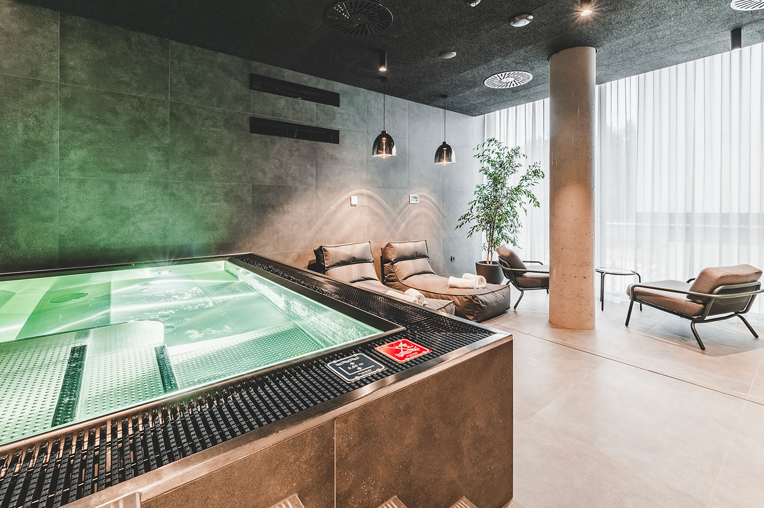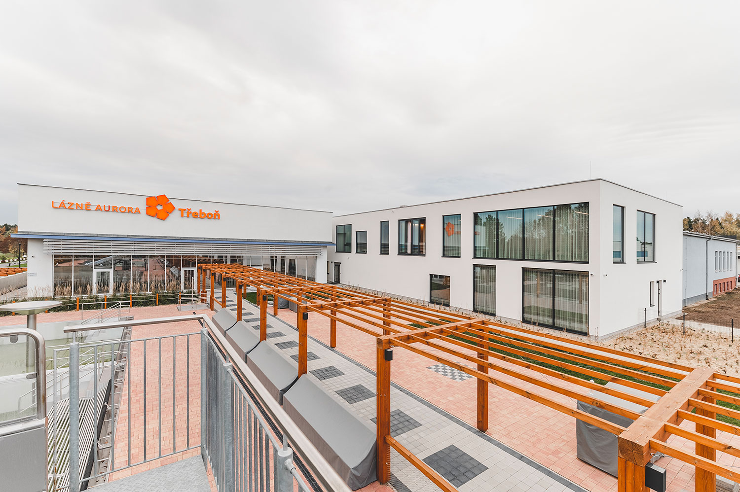 Rozšíření saunového provozu a wellness lázní Aurora plynule navazuje na stávající lázeňský komplex a rozšiřuje jeho relaxační nabídku. Vstupní hala přirozeně vtahuje návštěvníky do interiéru, odkud přes šatny směřují k prvním atrakcím v podobě parních prostor a ochlazovacích bazénků. Ve vyšších podlažích se nachází odpočívárny s výhledem do zeleně, masážní a relaxační zóny i samostatná VIP část. Architektonické řešení pracuje s materiály odkazujícími na původní lázeňskou architekturu 70. let – světlou dlažbou, dřevěnými obklady a betonovými prvky. Celek působí klidně, soudobě a zároveň respektuje charakter lázeňského prostředí.