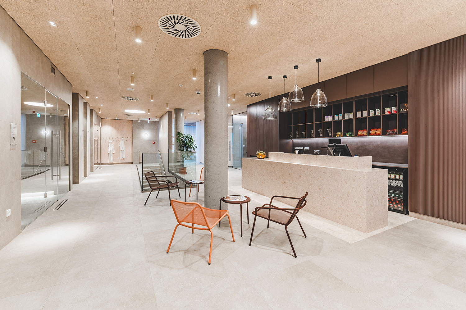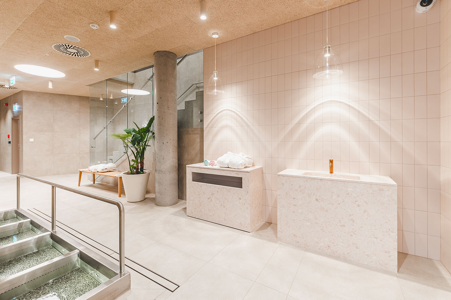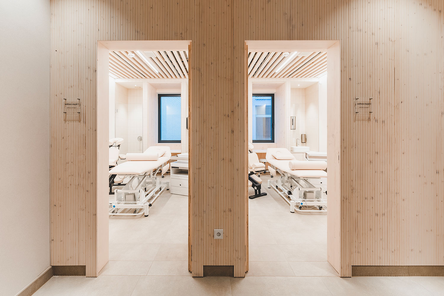 Rozšíření saunového provozu a wellness lázní Aurora plynule navazuje na stávající lázeňský komplex a rozšiřuje jeho relaxační nabídku. Vstupní hala přirozeně vtahuje návštěvníky do interiéru, odkud přes šatny směřují k prvním atrakcím v podobě parních prostor a ochlazovacích bazénků. Ve vyšších podlažích se nachází odpočívárny s výhledem do zeleně, masážní a relaxační zóny i samostatná VIP část. Architektonické řešení pracuje s materiály odkazujícími na původní lázeňskou architekturu 70. let – světlou dlažbou, dřevěnými obklady a betonovými prvky. Celek působí klidně, soudobě a zároveň respektuje charakter lázeňského prostředí.