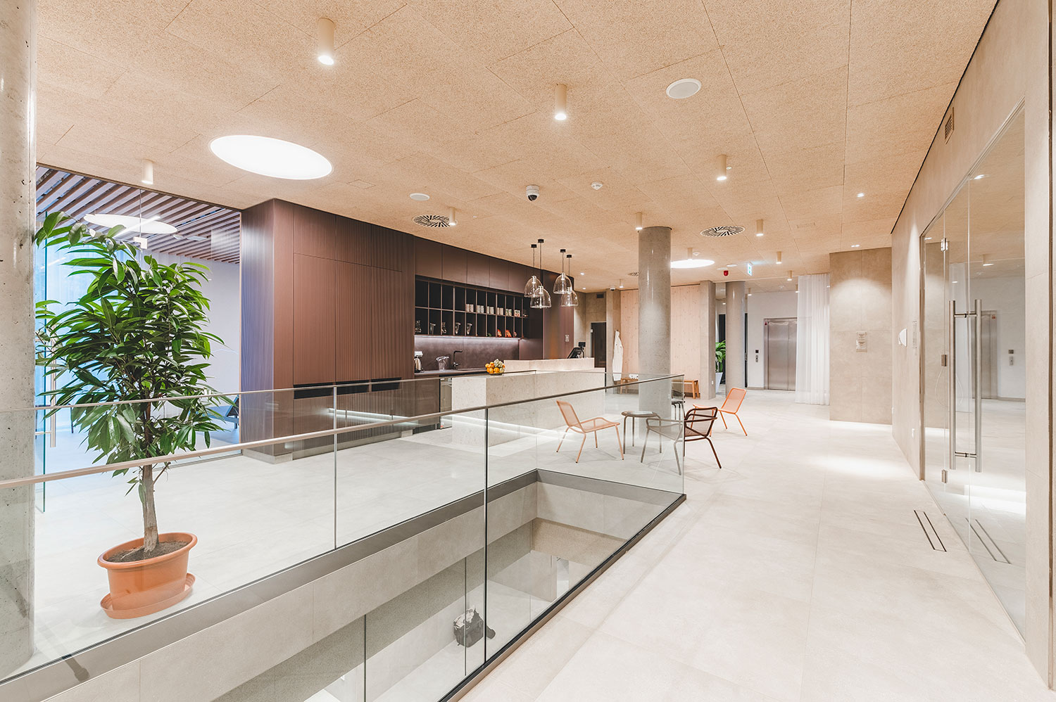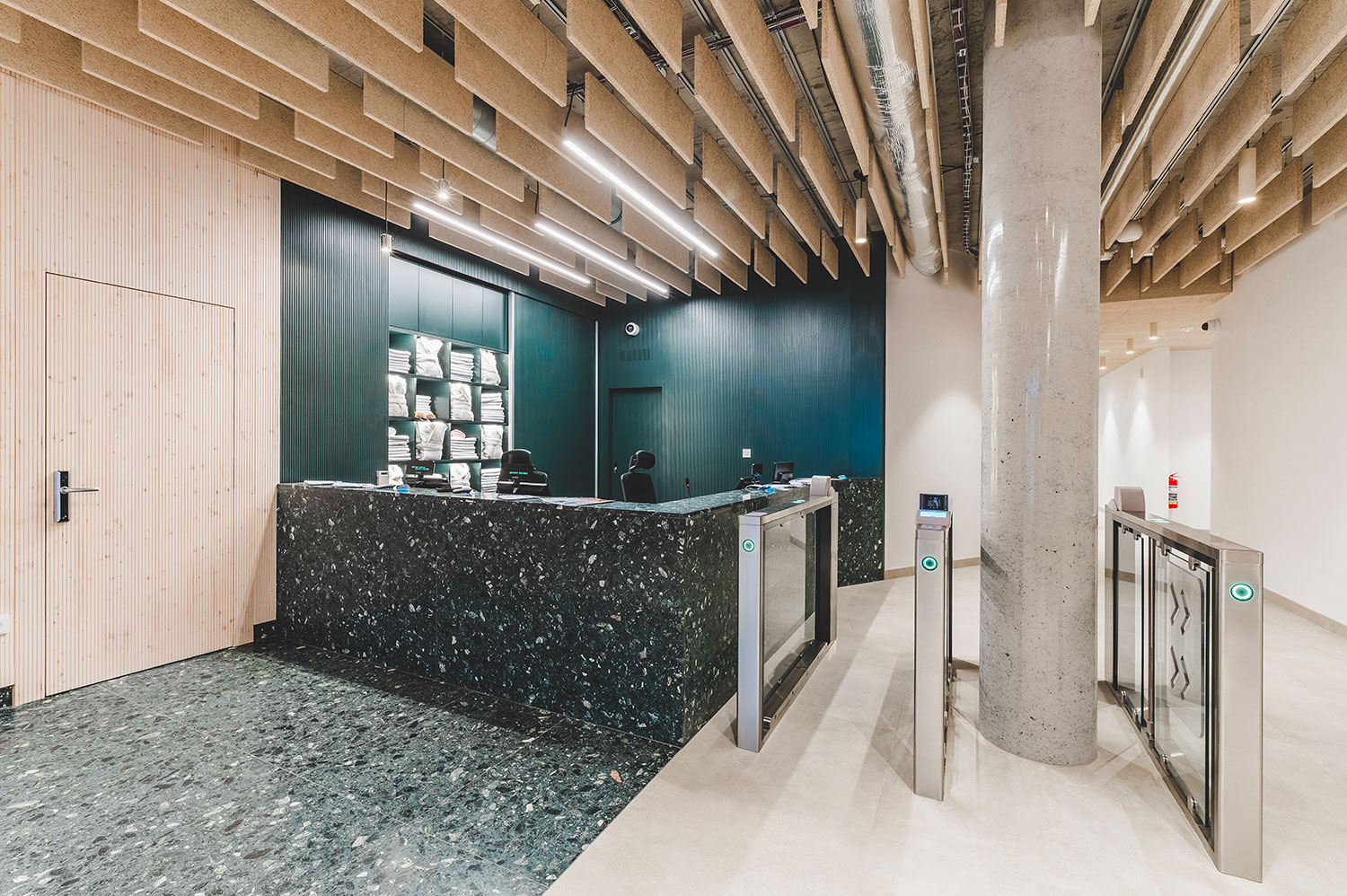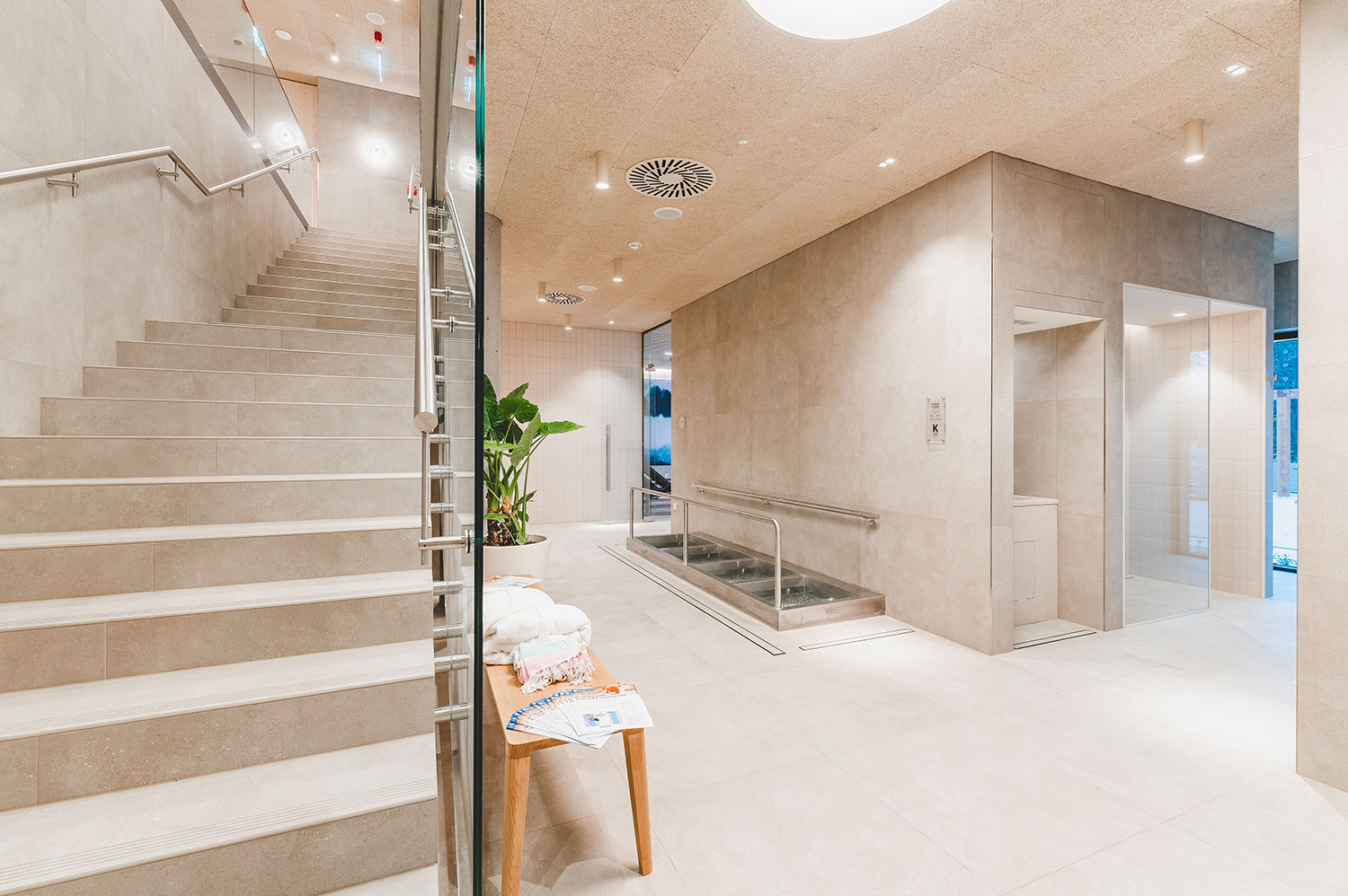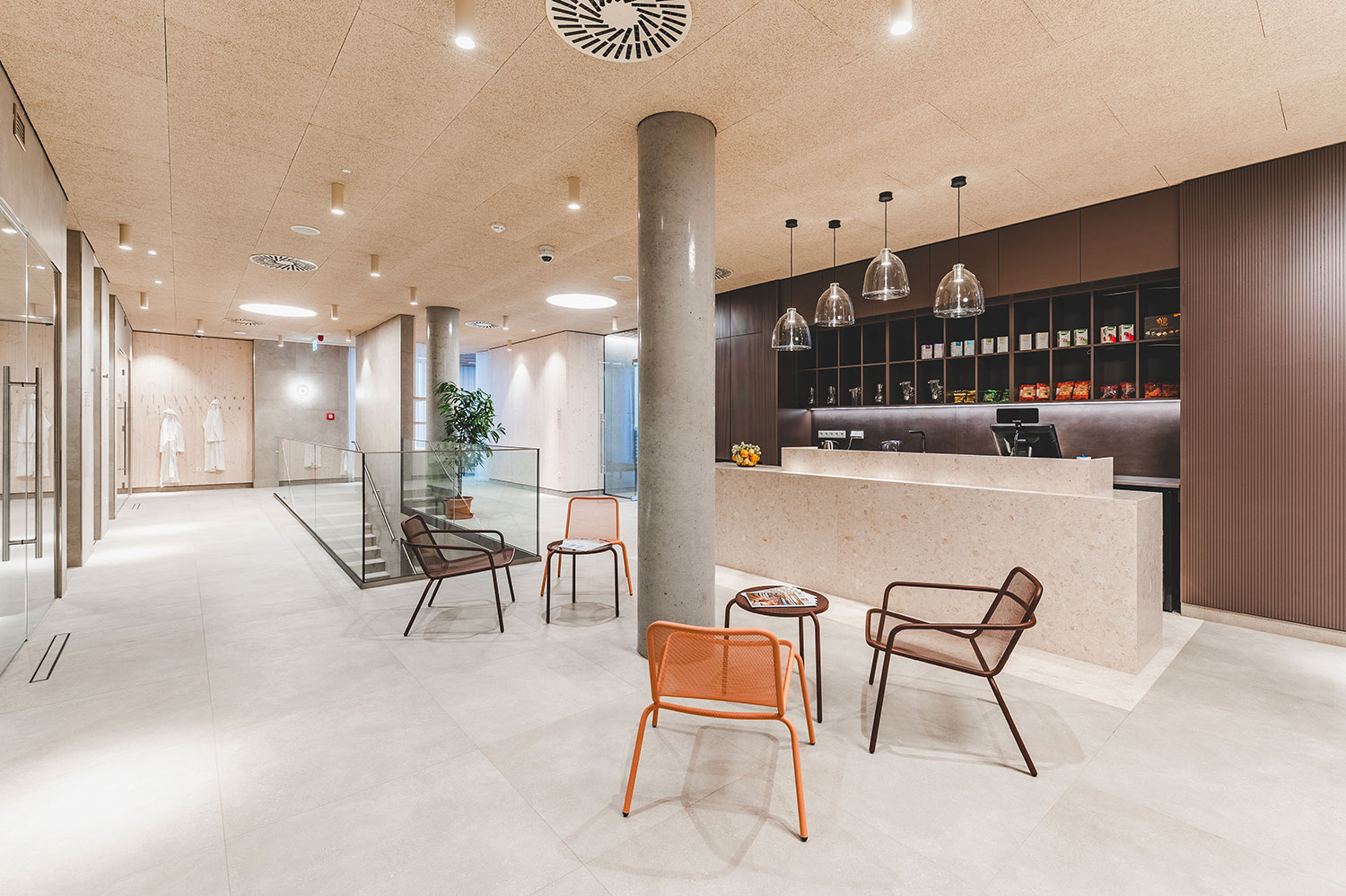 Rozšíření saunového provozu a wellness lázní Aurora plynule navazuje na stávající lázeňský komplex a rozšiřuje jeho relaxační nabídku. Vstupní hala přirozeně vtahuje návštěvníky do interiéru, odkud přes šatny směřují k prvním atrakcím v podobě parních prostor a ochlazovacích bazénků. Ve vyšších podlažích se nachází odpočívárny s výhledem do zeleně, masážní a relaxační zóny i samostatná VIP část. Architektonické řešení pracuje s materiály odkazujícími na původní lázeňskou architekturu 70. let – světlou dlažbou, dřevěnými obklady a betonovými prvky. Celek působí klidně, soudobě a zároveň respektuje charakter lázeňského prostředí.