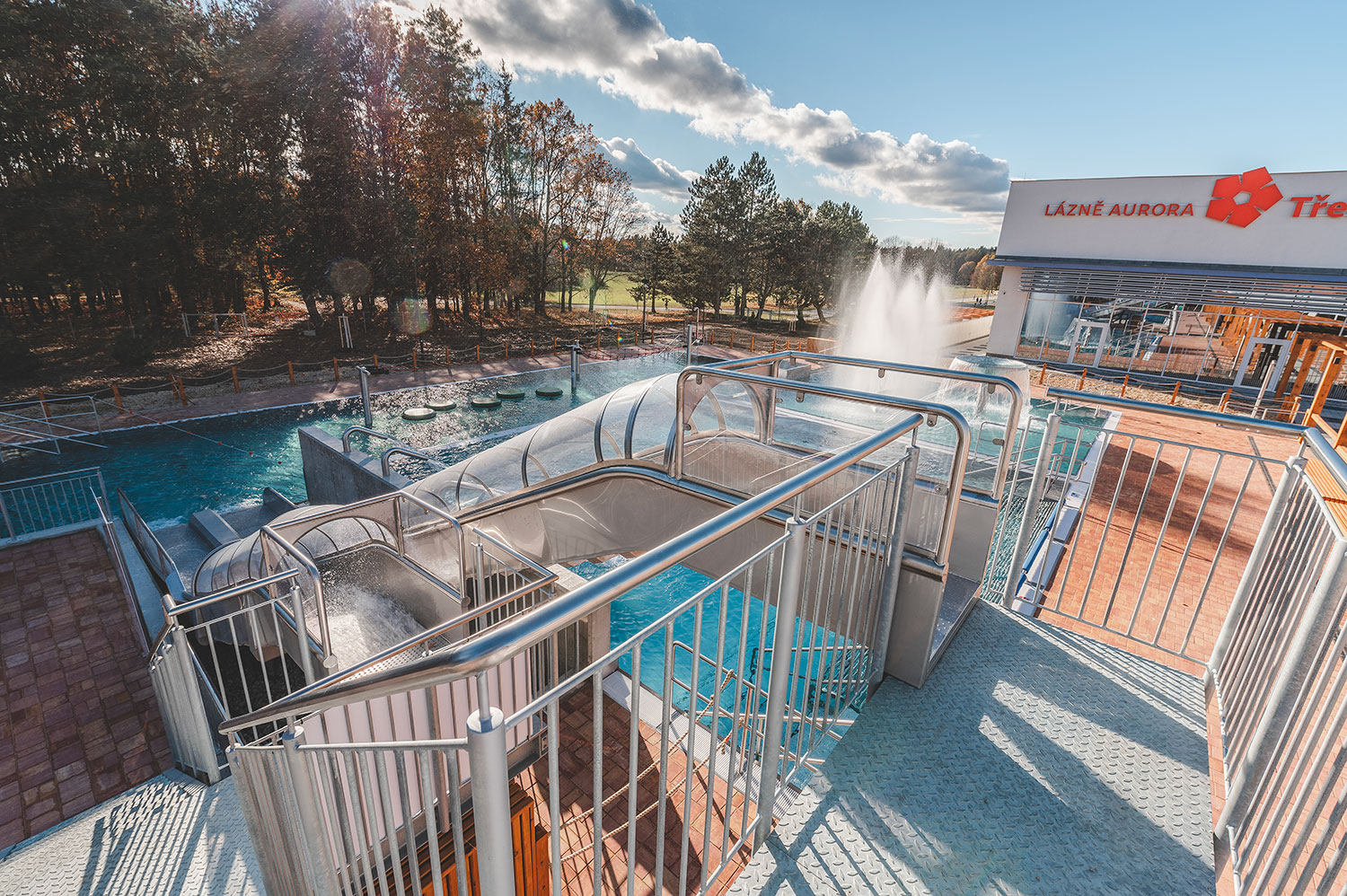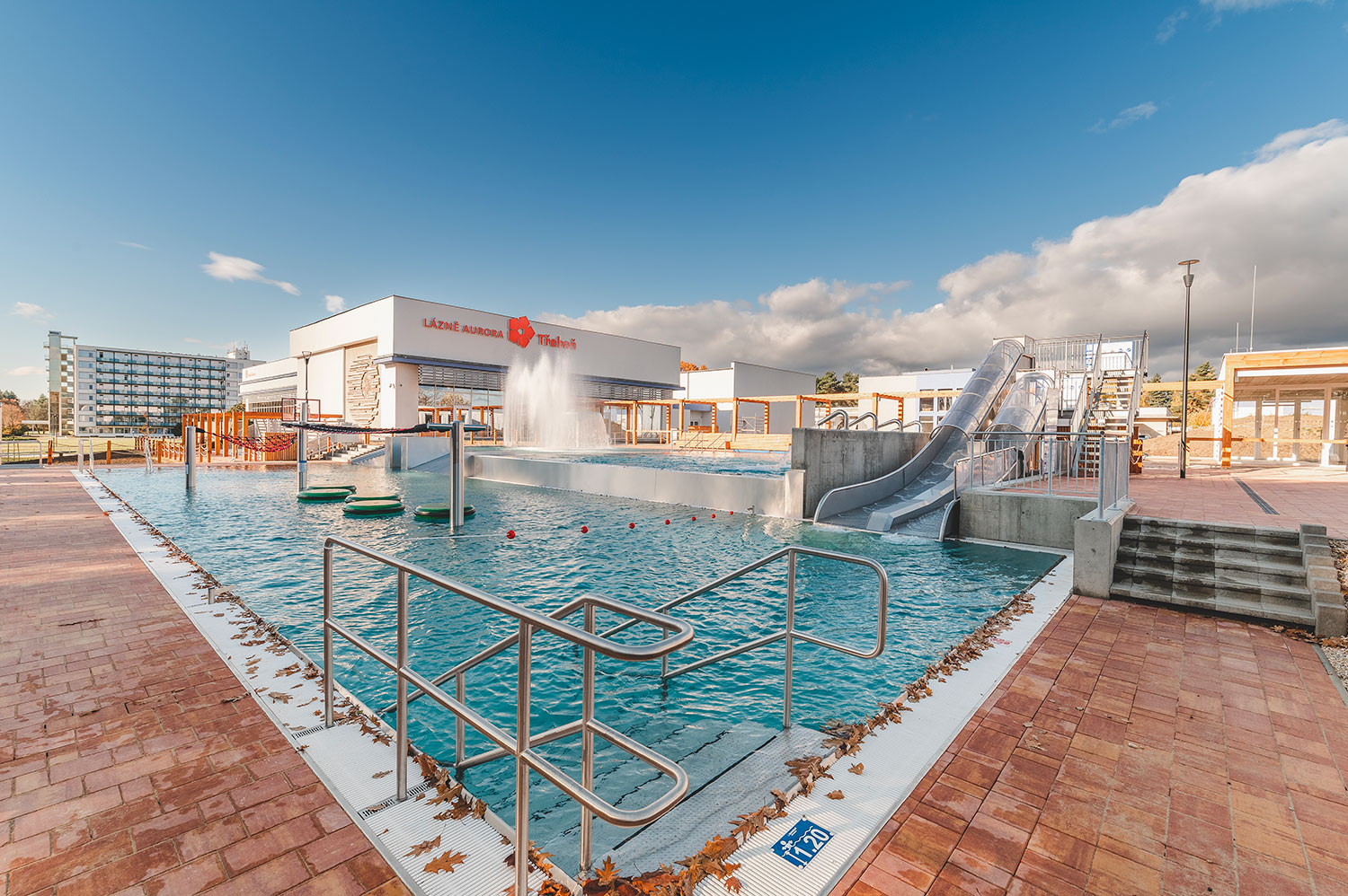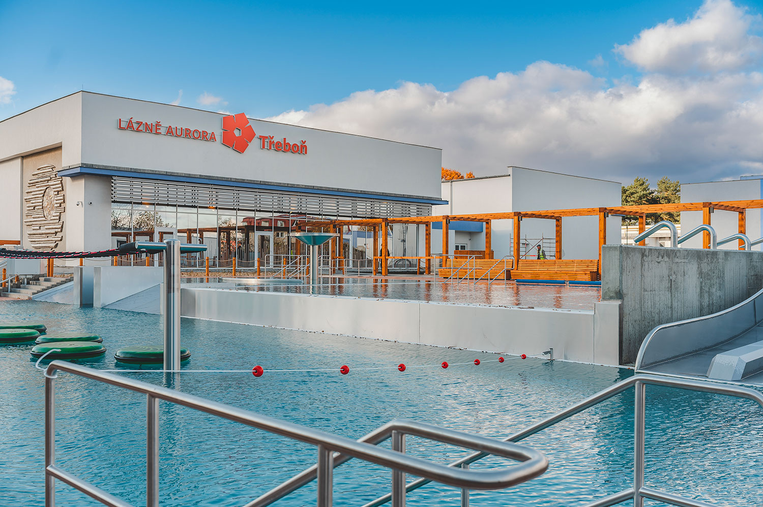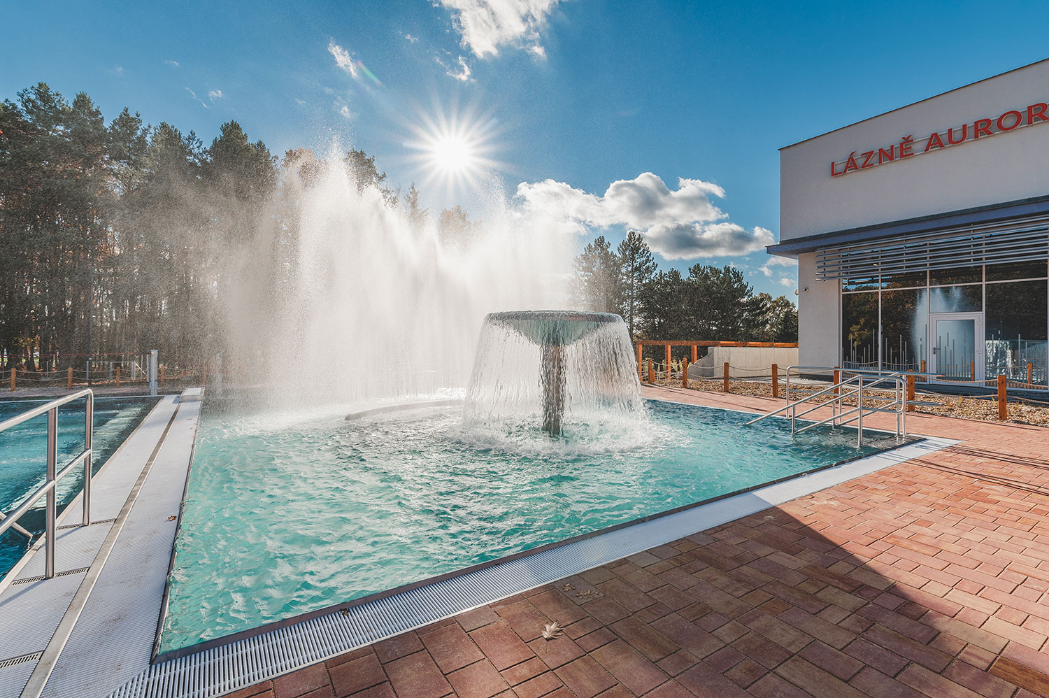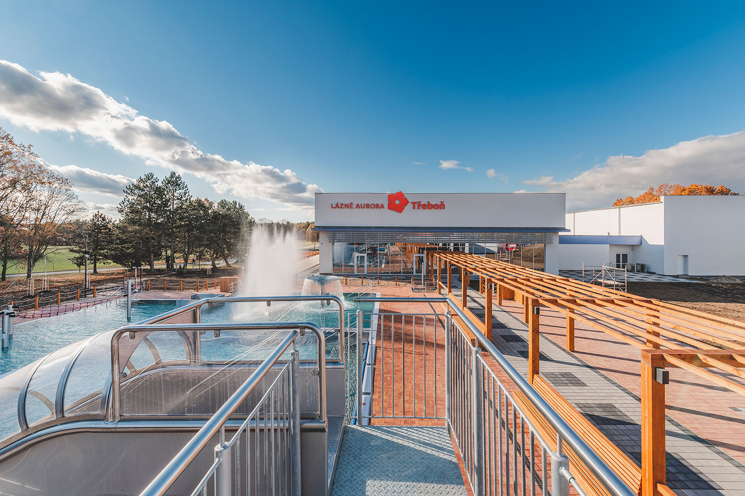 Rozšíření wellness centra lázní Aurora plynule navazuje na stávající lázeňský areál v bezprostřední blízkosti parku a rybníka Svět. Projekt přináší moderní venkovní wellness zónu s několika typy bazénů – relaxačním, kondičním, dětským a vířivkou – doplněnou o klidové a odpočinkové plochy lázeňského charakteru. Areál je rozdělen do funkčních zón pro všechny věkové kategorie a klade důraz na komfort, bezpečnost a bezbariérové užívání. Součástí řešení je provozní objekt s restaurací, zázemím pro návštěvníky a podzemním objektem s technologiemi, nové komunikační plochy, kolonáda a citlivě upravený terén. Architektonické a krajinářské řešení respektuje charakter CHKO Třeboňsko i okolní zástavbu a přirozeně zapadá do lázeňského prostředí.
